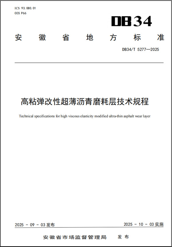 历经3年筹备,经安徽省市场监督管理局、安徽省交通运输厅批准,由安徽和记官网投资集团有限公司参编的《高弹粘改性超薄沥青磨耗层技术规程》安徽省地方标准,于2025年9月3日正式发布,10月3日正式实施。