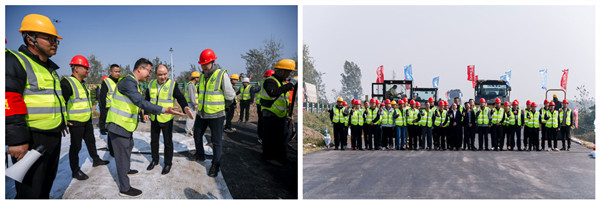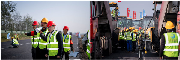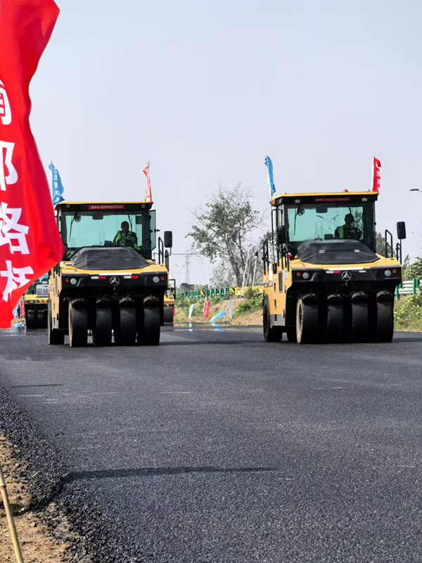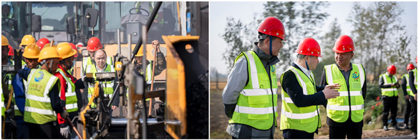 交底完毕后,“摊铺正式开始!”随着集团宋董事长一声令下,摊铺机、压路机等设备迅速启动、协同作业,摊铺机匀速推进,将均匀拌合的沥青混合料精准摊铺。观摩人员跟随着施工技术负责人束伟的讲解,沿着现场施工动线,仔细观摩各环节的标准化作业流程:作业面准备阶段,依托GNSS-RTK技术对道路中桩、边桩精准放样;摊铺环节,两台摊铺机按科学分幅协同作业,严格把控熨平板预热温度、摊铺速度及松铺系数;碾压过程中,3台双钢轮压路机、3台胶轮压路机按照“前静、后振、高频、低幅、不超压、不漏压”的原则进行标准化碾压流程,依次完成初压、复压、终压三道关键工序。整个施工过程规范有序、衔接顺畅,各环节精准配合,一条平整度高、密实度好、外观整洁的沥青路面逐渐成型,直观展现了标准化施工与新技术融合的实践成效。