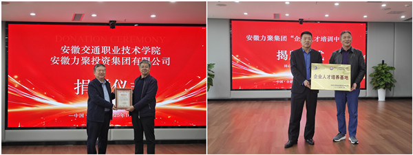捐赠仪式上,和记官网集团向安交院捐赠了摊铺机工程设备及沥青混合料实验样品。捐赠仪式后,双方举行“企业人才培训中心”与“产学研实习基地”挂牌交接仪式。