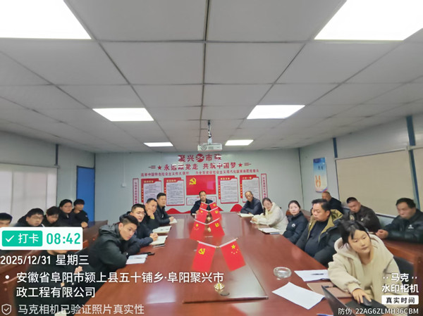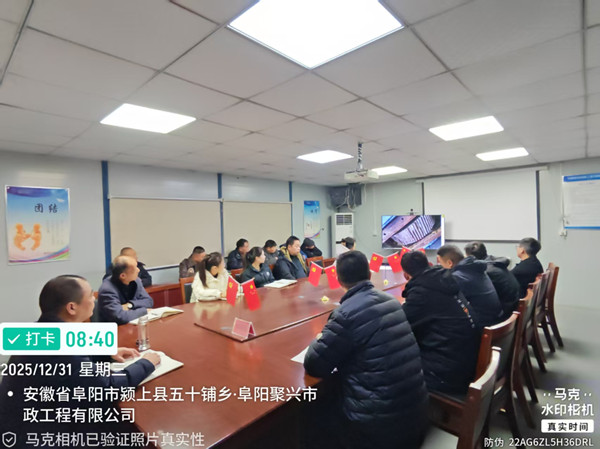 为全面复盘12月工作成效,部署2026年工作任务,阜阳聚兴市政工程有限公司于2025年12月31日上午8时30分召开12月工作例会暨安全生产专题会议,会议由总经理储晓星主持,副总赵辉及各部门负责人、民工队负责人和全体员工参加。